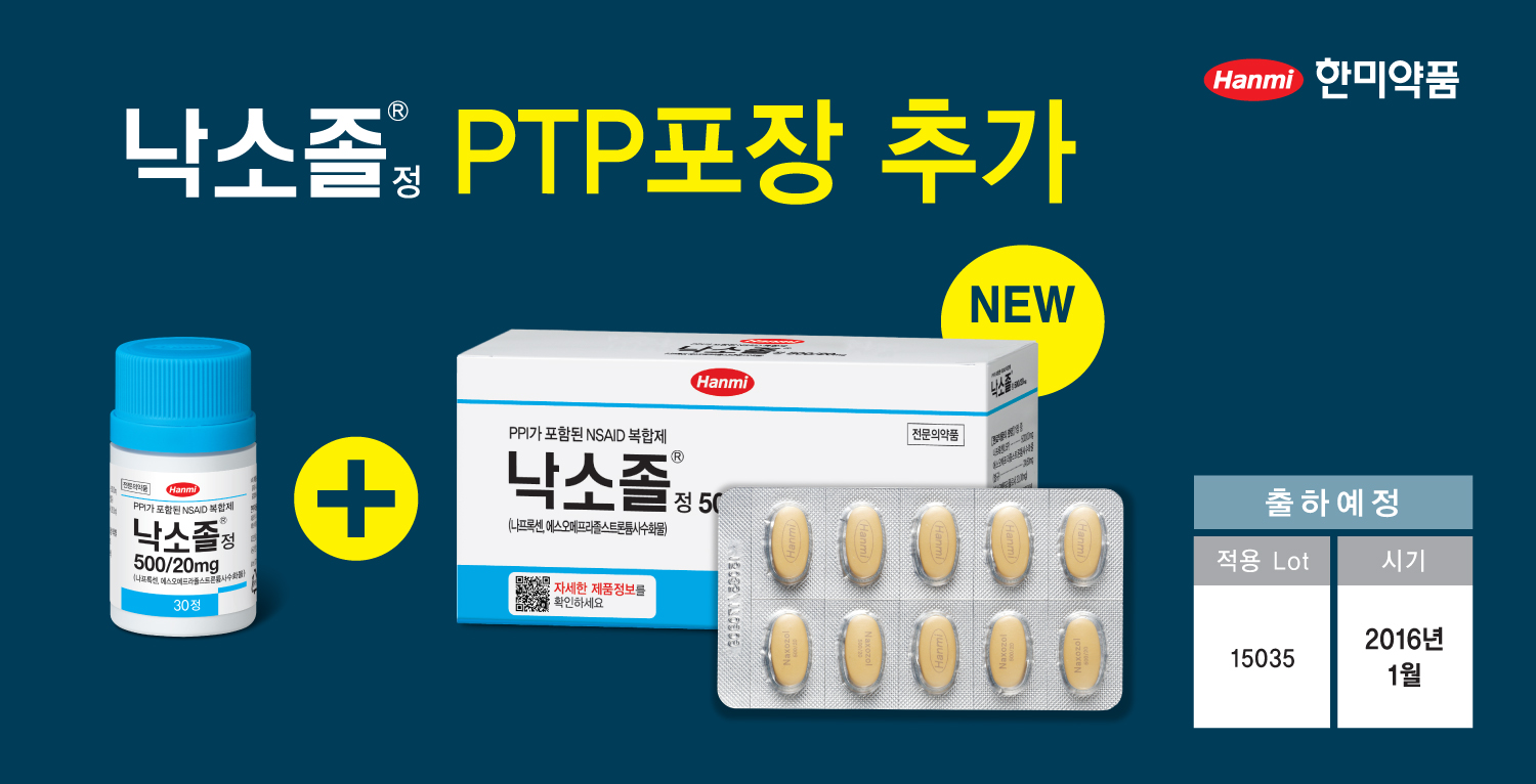 낙소졸 PTP포장은 제조번호 15035부터 적용되며, 2016년 1월부터 변경된 제품이 유통된다. 제품명 및 약가, 적응증, 처방가능 상병코드 등은 기존과 동일하다.