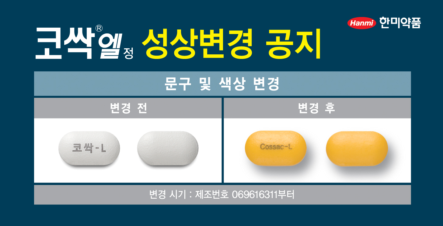 이번 변경은 코싹엘정 제조번호 069616311부터 적용되며, 기존 재고가 소진되는 6월 말 이후부터 유통될 예정이다. 제품명 및 약가, 적응증, 처방가능 상병코드 등은 기존과 동일하다.