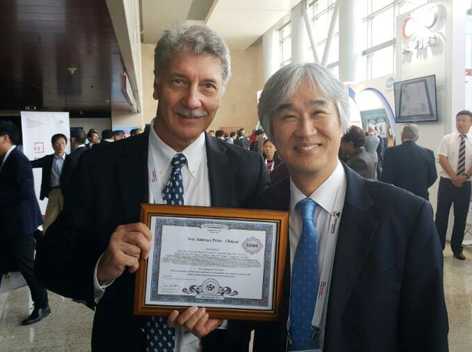 세계성의학회 웨인 헬스트롬 회장(左)과 가톨릭대 김세웅 교수(右)가 탐스로신·타다라필 복합제의 임상부문 최우수 연제상 수상 후 기념사진을 촬영하고 있다. 김 교수는 이 복합제의 3상 결과를 세계성의학회에서 지난 23일 발표했다.