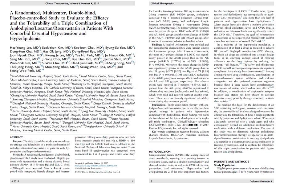 이번에 게재된 아모잘탄큐 연구는 삼성서울병원 순환기내과 박승우 교수가 책임을 맡은 임상 3상 (ALRO-301)으로, 국내 23개 기관에서 고지혈증을 동반한 고혈압 환자 146명을 대상으로 아모잘탄큐 투여군의 유효성과 내약성을 확인했다.