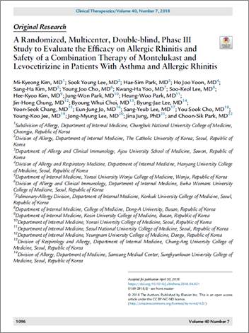 이번에 등재된 연구는 순천향병원 호흡기내과 박춘식 교수 외 22개 기관에서 시행한 임상 3상(HM-MOLZ-302)으로, 천식과 알레르기 비염을 동반한 환자 220명을 대상으로 몬테루카스트 단일제와 몬테리진캡슐을 1일 1회 4주간 투약하는 방식으로 진행됐다.