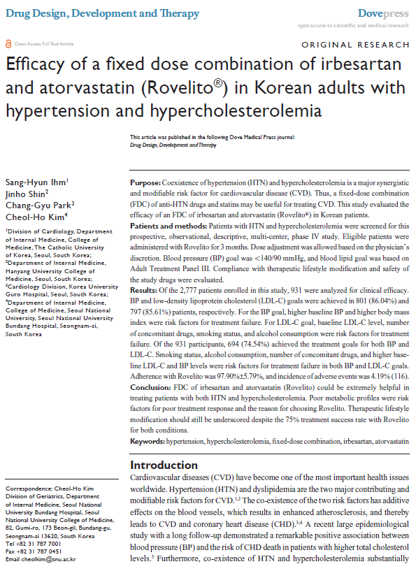한미약품 고혈압ㆍ이상지질혈증치료 복합신약 ‘로벨리토’의 임상 4상 연구 결과가 국제학술지 Drug, Design, Development and Therapy(2019:13:633-645)에 등재됐다.