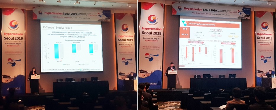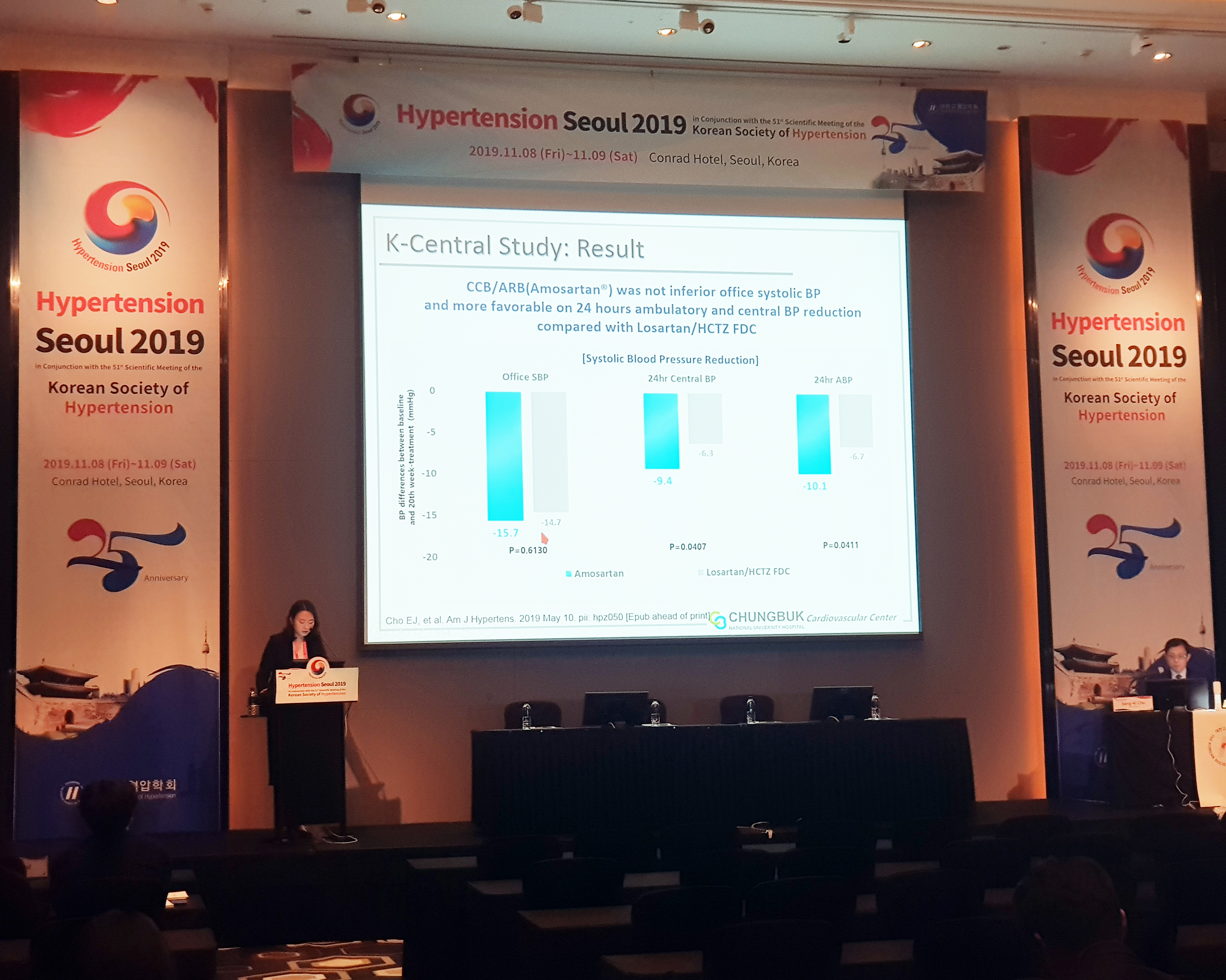 이어 “대한고혈압학회에서 주관했던 The K-Central study는 병용 요법에 있어 CCB와 ARB의 조합인 아모잘탄이 ARB와 이뇨제의 병용 요법보다 우수한 중심혈압 및 활동혈압 조절 효과를 증명했다”고 강조하며 “실제 외래 진료시 중심혈압을 직접 측정하는 것은 어려운데, 중심혈압 조절 효과를 보인 아모잘탄을 사용함으로써 진료실 혈압과 중심 혈압을 동시에 낮추는 효과를 노릴 수 있겠다”고 덧붙였다.